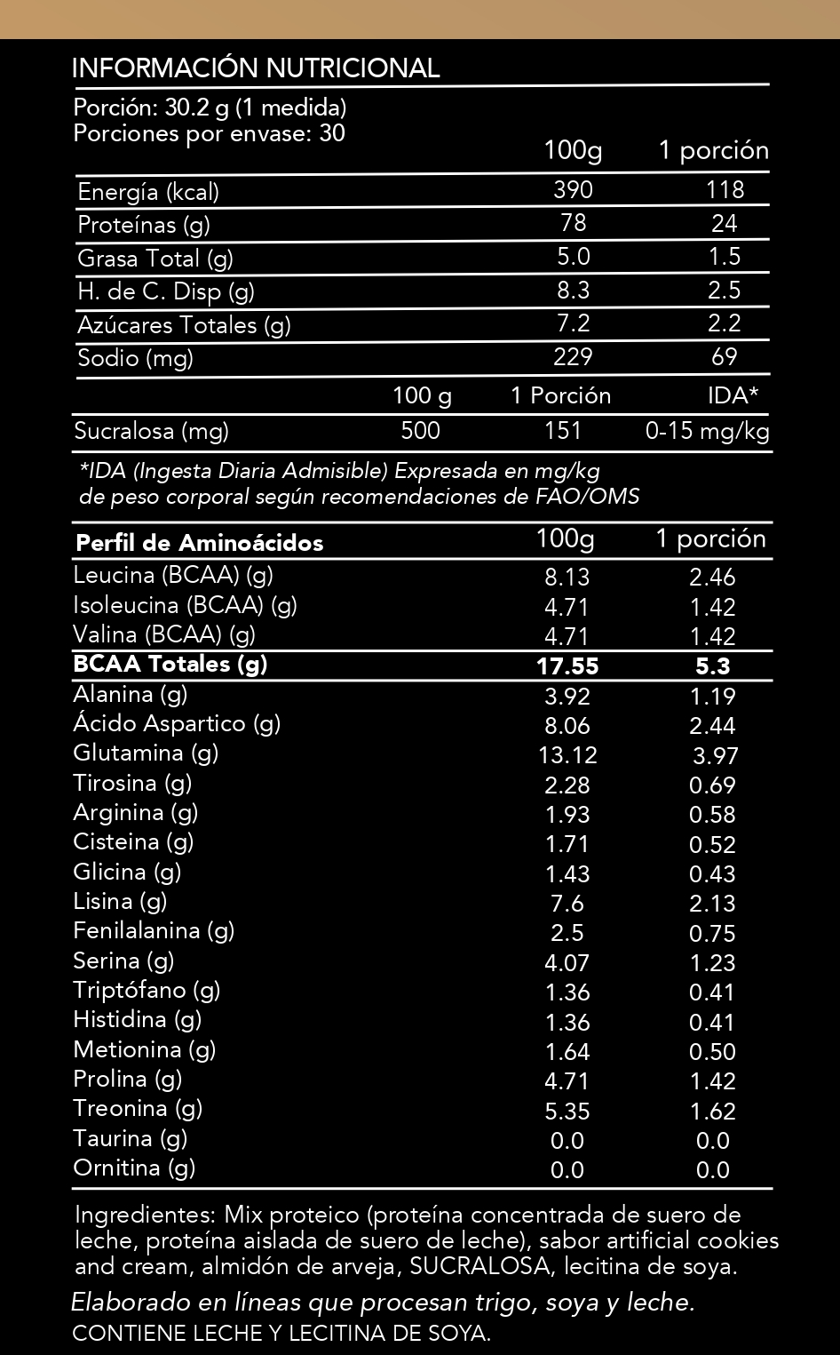 Cada porción otorga 24 gramos de proteína de alta calidad, ideal para satisfacer las demandas nutricionales después del entrenamiento. Nuestras proteínas de suero de leche son una opción excepcional para mejorar el rendimiento atlético y promover el crecimiento muscular, con un perfil de aminoácidos ramificados o BCAA más completo que otras opciones disponibles en el mercado, ya que cada porción aporta tan solo 118 calorías y 2,5 gramos de Leucina, aminoácido esencial clave para activar la reparación y construcción muscular.